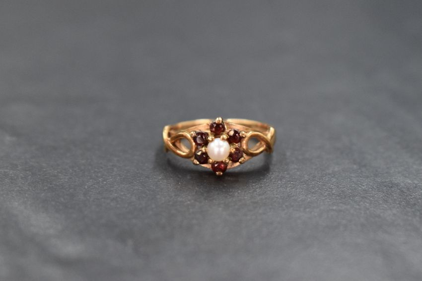 A 9ct gold pearl and garnet set cluster ring, the central cultured split pearl in a six round cut garnet surround, having decorative pierced shoulders, marked 375, ring size K-L, 2.6g