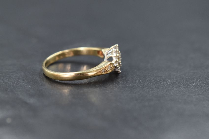 A 9ct gold diamond square cluster ring having sixteen small diamond chips in a pave set square mount with set shoulders, total approx 0.32ct on a 9ct gold loop, size O & approx 2.5g
