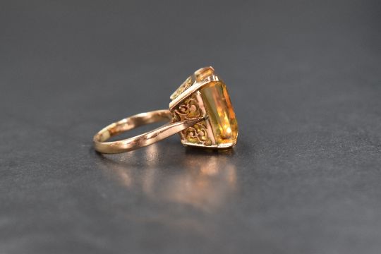 A 14ct gold citrine set ring, the emerald cut citrine measuring approximately 14.2mm x 11.5mm x 11.1mm, in a four claw setting with ornate gallery, marked 14K, ring size K-L, 6.1g