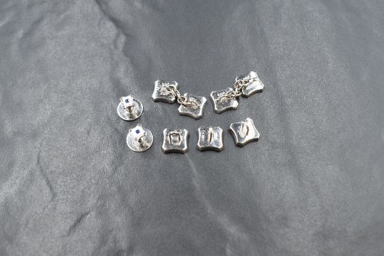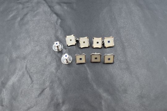 A cased set of 9ct white gold mother-of-pearl and sapphire set cufflinks and collar pins, of concave square form having mother-of-pearl panels with central square cut sapphires, marked 375, 8.8g. The cufflinks missing sapphires