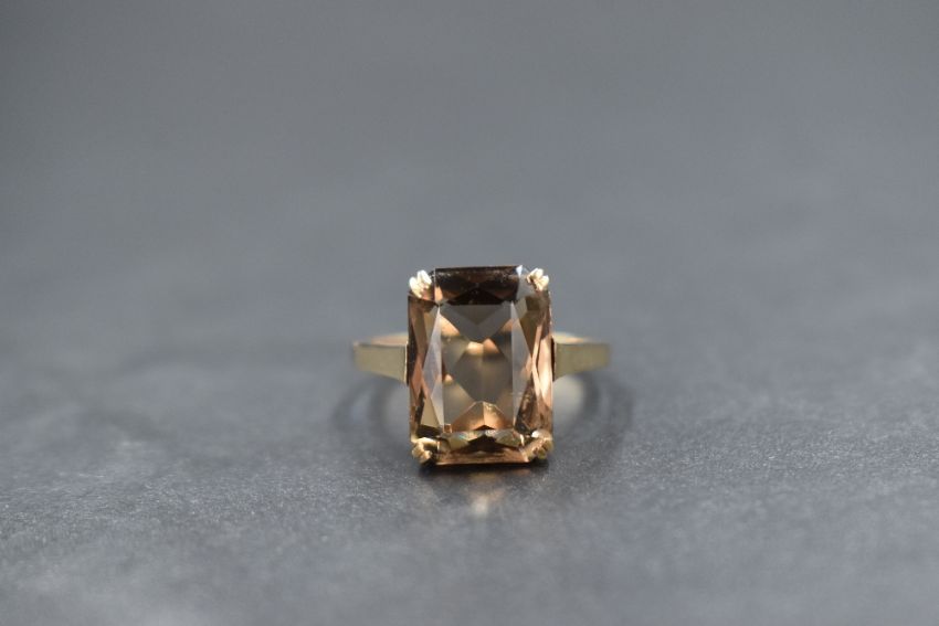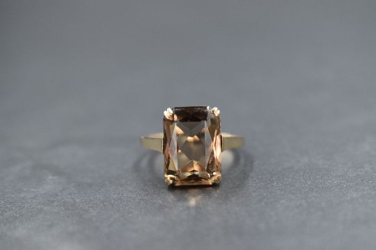 A 9ct gold smoky quartz set dress ring, the emerald cut smoky quartz, measuring approximately 13.4mm x 9.3mm x 7mm, in a four claw setting, marked 375, ring size O, 3.4g