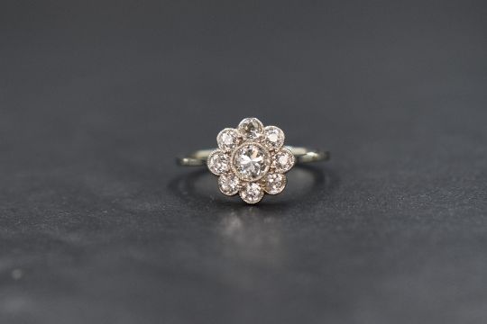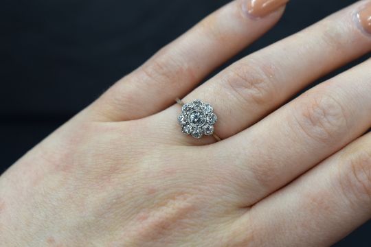 An 18ct white gold diamond set cluster ring, the central round brilliant cut diamond measuring approximately 0.20ct, in an eight round brilliant cut surround, each measuring approximately 0.05ct, marked 18ct & Plat., ring size L-M, 2.2g