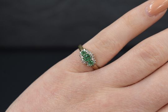A 9ct gold emerald and diamond ring, the central trio of small emeralds within a border of diamond chips on a 9ct gold loop, size H & approx 2g