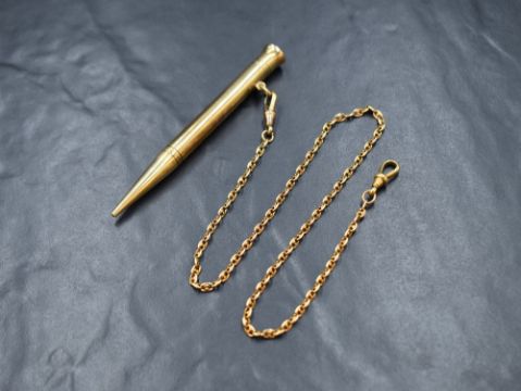Condition report: Mechanical pencil does not work and has general surface wear and dents to the top. Chain is in good condition