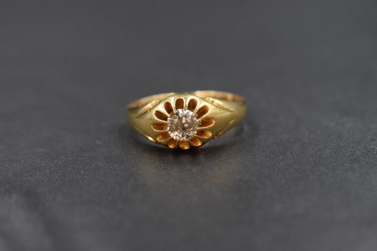 An 18ct gold diamond set gypsy style ring, the old cut diamond measuring approximately 0.33ct, in a twelve claw pierced setting with decorative shoulders, marked 18 with hallmarks, ring size Q-R, 4.7g