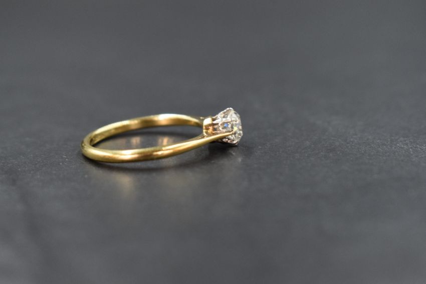 A yellow metal diamond solitaire ring having an old cut diamond of approx 0.75ct in a claw set mount to knife blade shoulders on a yellow metal loop stamped 18ct & plat, size N/O & approx 2.5g