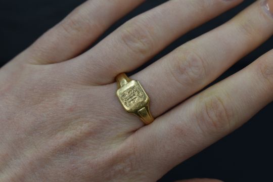 An 18ct gold signet ring, the square panel having 'B' initial engraved with decorative shoulders, marked 18 with hallmarks, ring size T, 6.8g