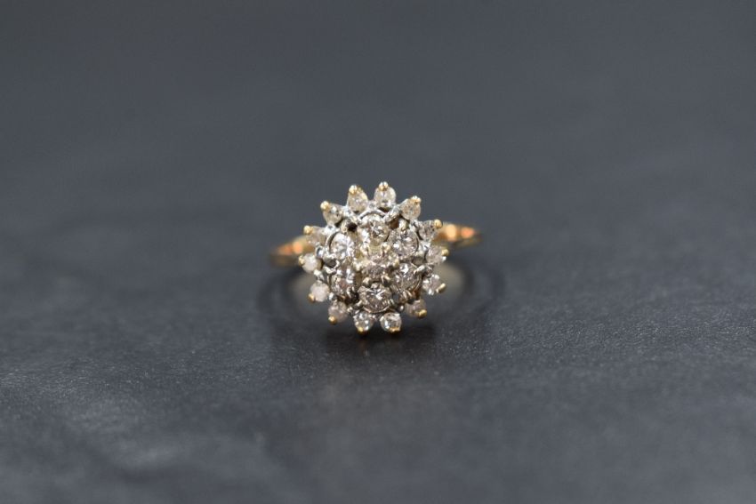 A yellow metal presumed gold diamond set cluster ring, the central diamond with a six diamond surround, followed by a further fourteen diamond surround, rubbed mark to the shank, ring size M-N, 3.2g
