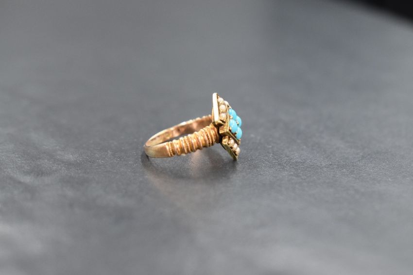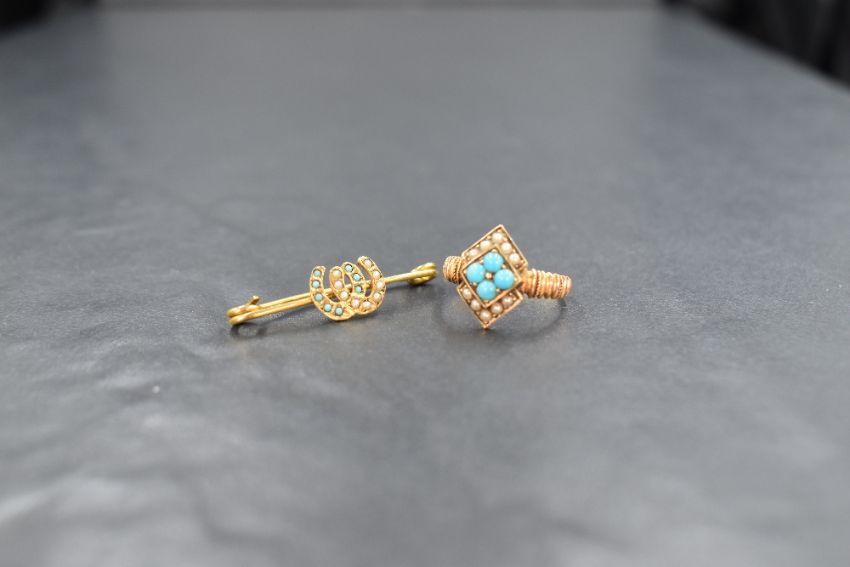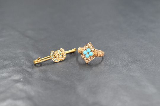 A yellow metal presumed gold turquoise and seed pearl set ring, the four central turquoise cabochons within a lozenge mount flanked by two rows of seed pearls all in a vertical alignment, having decorative shoulders and rubbed hallmarks to the shank, along with a yellow metal presumed gold turquoise and seed pearl set brooch, having two horseshoes one being turquoise set and the other pearl set, with rubbed marks to the pin, ring size J-K, 4.1g