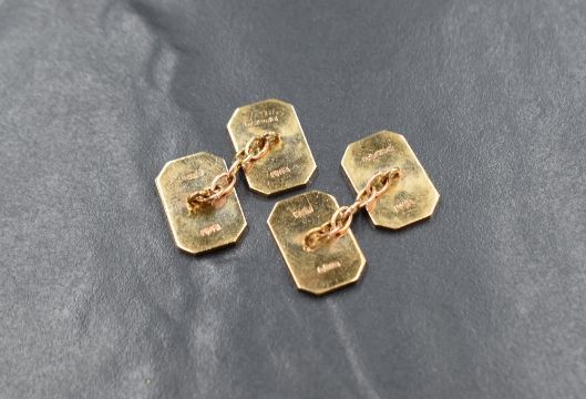 A pair of 9ct gold cufflinks having engraved front panels with chain connectors to back panels, appprox 9.9g, with case
