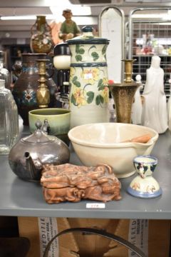 A pair of early 20th century brass candlesticks having geometrical patterns, h28cm, sold together with a silver plated tea pot and a ceramic bowl ect, (10)
