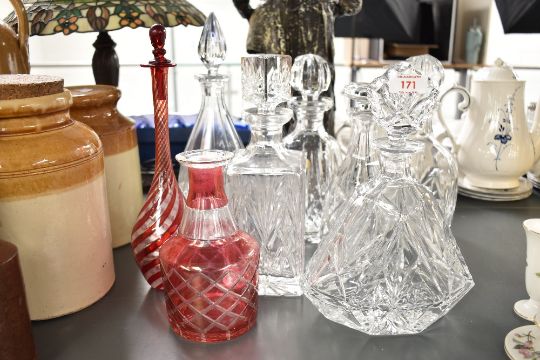 A Thomas Webb crystal glass decanter of triangular form, h26.5cm, sold together with a Bohemia crystal glass decanter and a red glass decanter having swirl pattern ect, (8)
