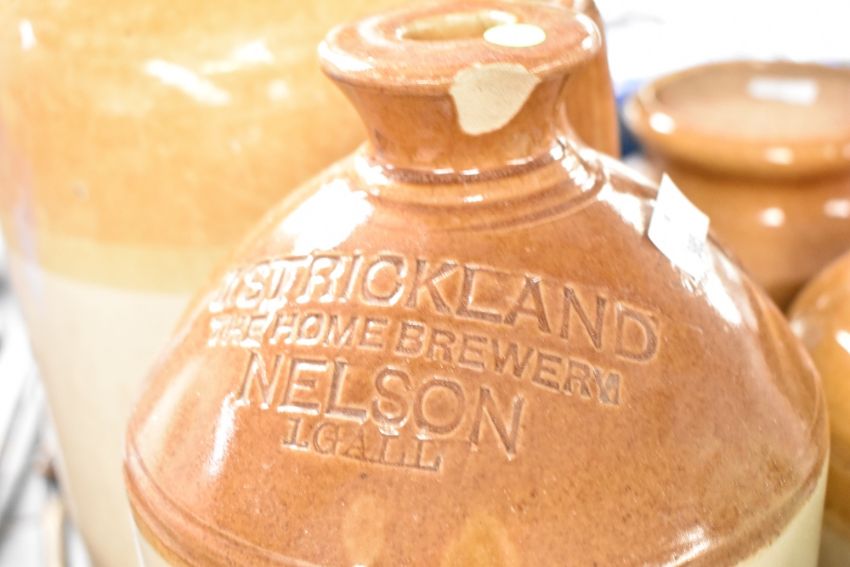 A stoneware flagon having impressed mark reading; 'J.Strickland The Home Brewers Nelson 1.Gall', h32cm, sold together with a green stoneware flagon, 2 pots and 2 bottle jars ect, (9) Condition report: Damaged