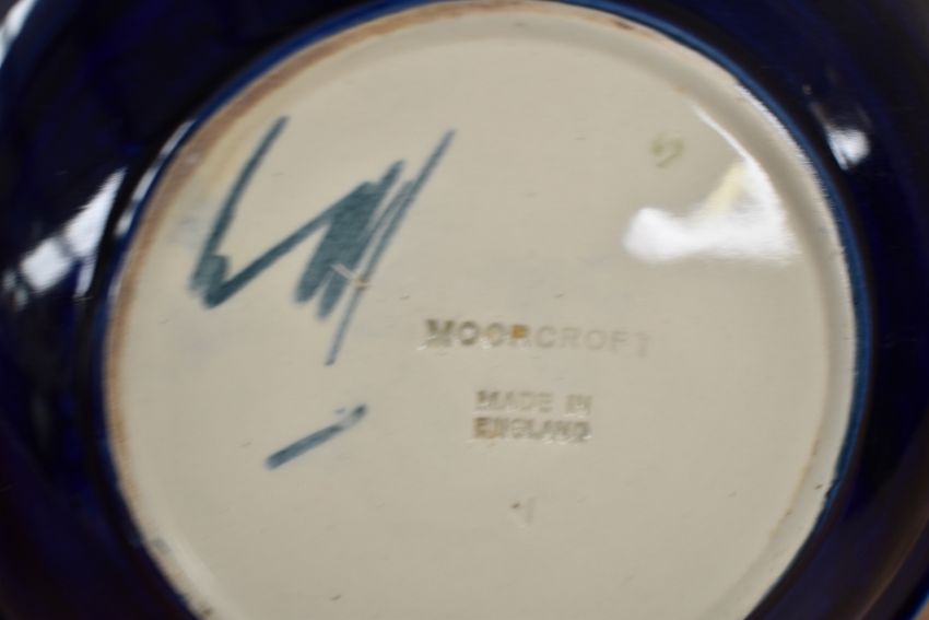 A Moorcroft pottery 'Climatus' pattern plate, having tub lined floral decoration on a cobalt blue ground, impressed and signed to base, w18cm, sold together with a similar vase, (2)