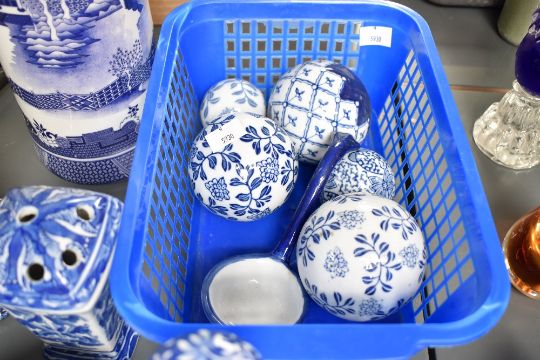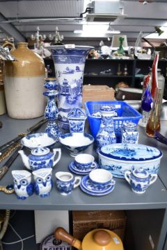 A porcelain blue and white vase of flared form, decorated with Chinese landscape and geometrical patterns, h35cm, sold together with a pair of owls, tea pot and trinket box with cover ect, (22)