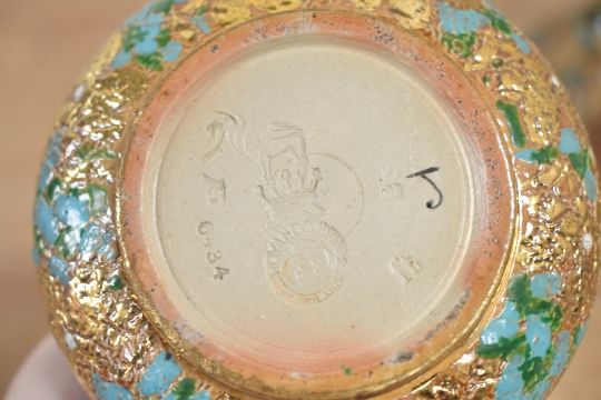 A pair of Royal Doulton stoneware vases of bottle form, decorated in the Art Nouveau style having turquoise and brown enamel body and green crackle finish neck, impressed marks to base, No '6434', h17cm