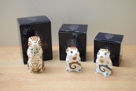 A group of three Royal Crown Derby bone china paperweights comprising 'Chester Chipmunk', 'Mouse' and 'New Year Mouse' all having Imari style decoration and gold coloured stopper, boxes are present.