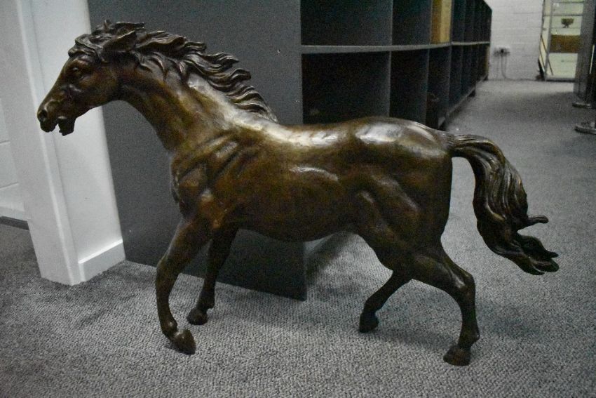 A large brass horse study, measuring 66cm x 99cm, having slight oxidisation in places.