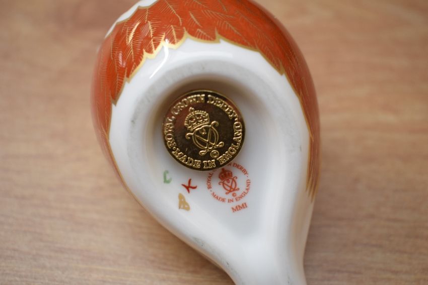 Two Royal Crown Derby bone china paperweights, Willow Tit and Chaffinch, both having Imari style decoration and gold coloured stoppers, boxes are present.