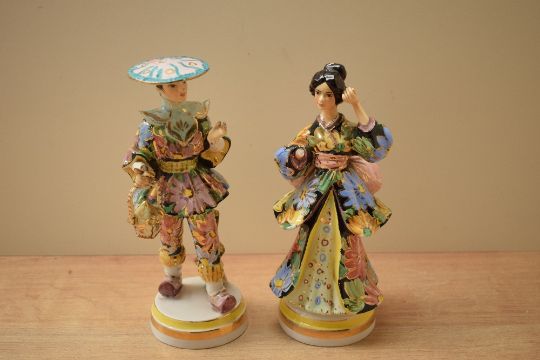 Two continental porcelain 'Liani' in the manner of Capo-Di-Monte figures/figurines, both measure 20cm tall with markings for Italy to bases one missing hand.