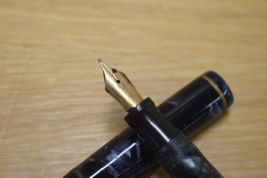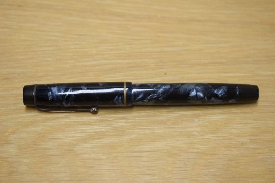 A Parker Duofold button fill fountain pen in Blue and Black marble with a narrow cap bands having a Parker Duofold 14K Pen N nib and original Parker Duofold sticker on barrel