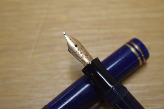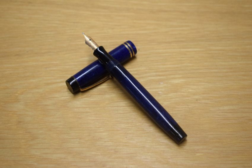 A Parker Duofold Junior Streamlined button fill fountain pen in lapis lazulii with two gold bands to the cap having a Parker 14K England 10 nib