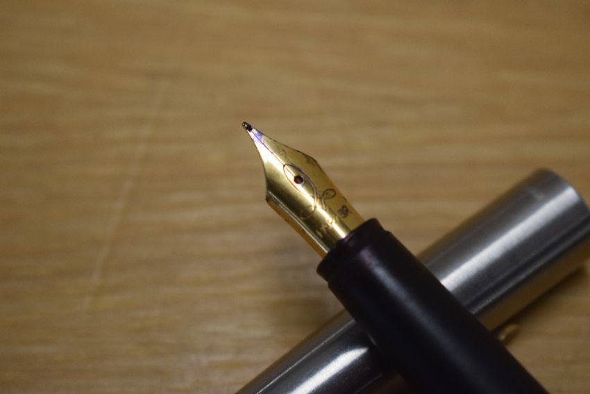 A Parker Frontier cartridge fill fountain pen in Flighter stainless steel with gold trim having Parker nib