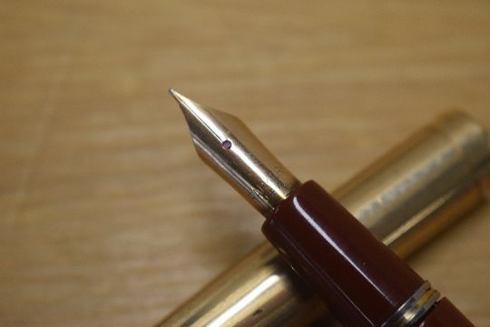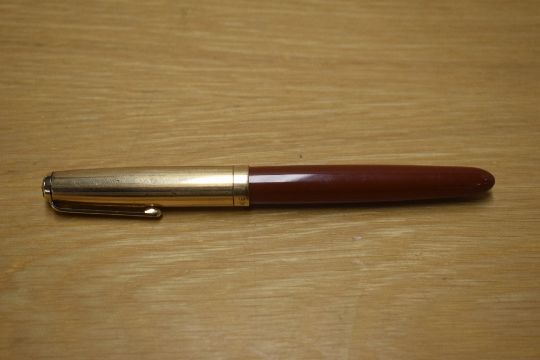 A Parker VP button fill fountain pen in Rust with a Rolled Gold cap having a Parker USA nib