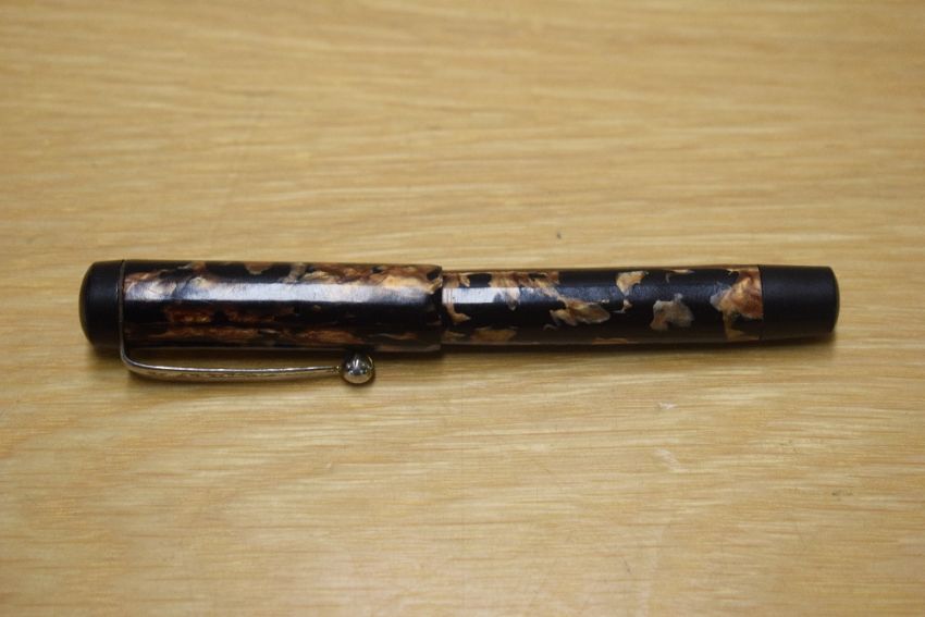 A Parker Duofold Junior button fill (presumed as it is to tight to open) in Black and Gold with bandles cap having Parker 14K 585 England 10 nib.