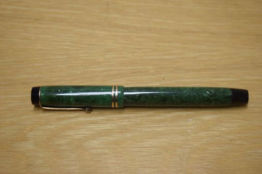 A Parker Duofold Senior button fill fountain pen in Green Jade with two narrow cap bands having Parker Duofold Pen Canada B nib