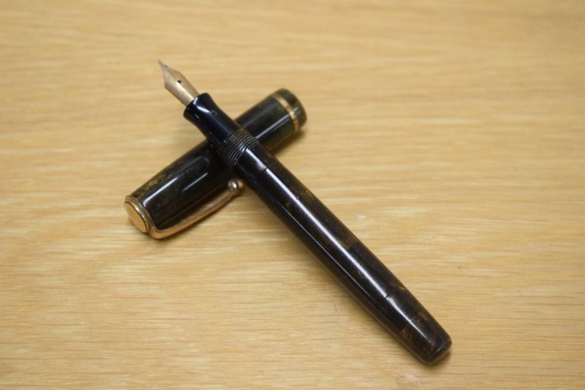 A Parker Moderne button fill fountain pen in Green and Gold with single narrow band to the cap having Parker Fountain Pen 2 Canada nib