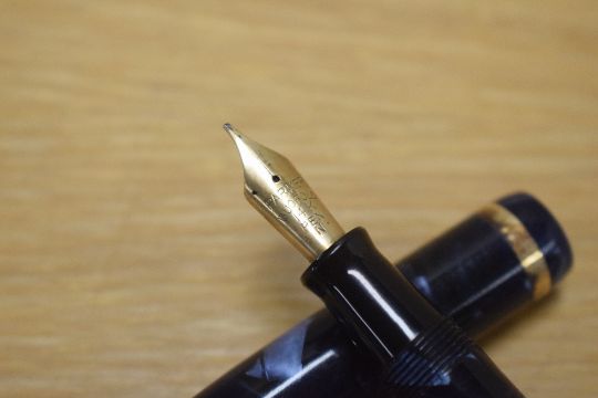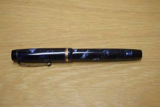 A Parker Duofold button fill fountain pen in Blue and Black marble with a wide cap bands having a Parker Duofold 14K Pen N nib