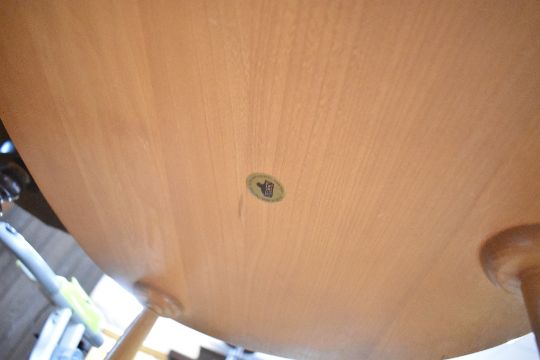 A nest of three Ercol pebble style tables, width approx. 65cm, badge to underside of large table