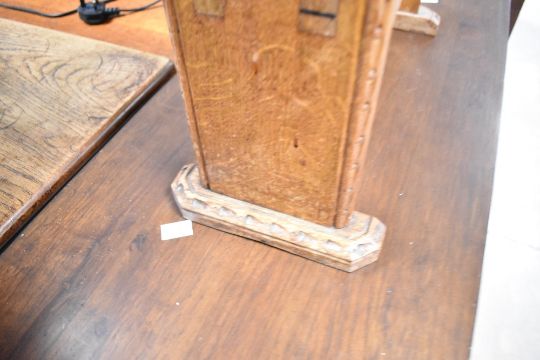 An Arts and Crafts golden oak drop leaf occasional table , most likely Arthur Simpson, having typical adzed style frame and exposed joints, though not labelled , width approx. 50cm