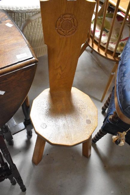 A traditional golden oak spinning chair in the Yorkshire oak style, with carved rose motif