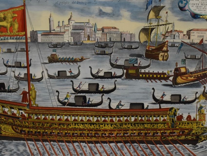 After Stefano Scolari (1652- 691) lithographic print, depicting the Bucintoro in navigation in front of San Giorgio, in the festivity of the 'Sensa' (Ascension) Venice 1619. To the foreground the magnificent galley of the Doges with the basin of San Marco is furrowed by gondolas, sailing ships and boats of the Venetian aristocrats, entitled “Il Meraviglioso Bucintoro, nel quale il Ser.mo Principe di Venetia va solennemente il dì dell?Ascensa à sposar il mare et con esso parimente fù fatto il gloriosissimo incontro al Ser.mo Antonio Priuli il giorno della serissima sua venuta al possesso del Principato” to upper centre, upper right having an oval cartouche, the dedication with the date in Roman letters of the printer Iustus Sadeler “Al generoso e … Conte Marco Trissino in segno d’animo divoto Giusto Sadeler ciò dedica e consacra 1619”, all within a blue card mount and modern gilt frame under glass 40cm x 56cm & 58.5cm x 74cm overall.