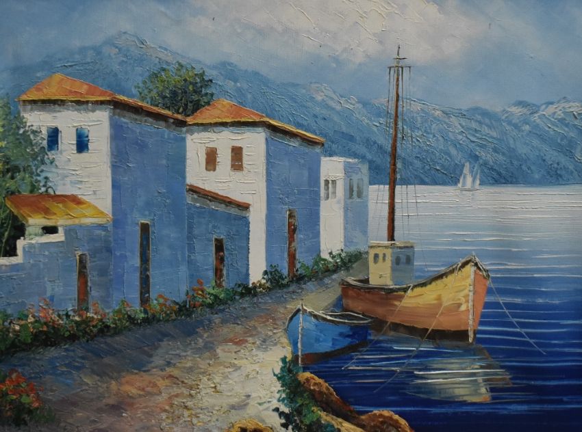 A colourful 20th century oil on canvas, Mediterranean coastal scene with boats, signed 'sautors' lower right, within a moulded frame with mosaic type design, 39cm x 49.5cm & 50cm x 60cm overall canvas without tension and has board behind.
