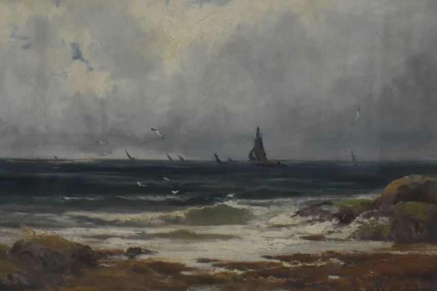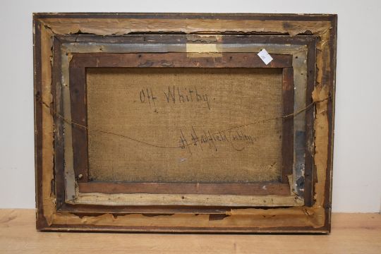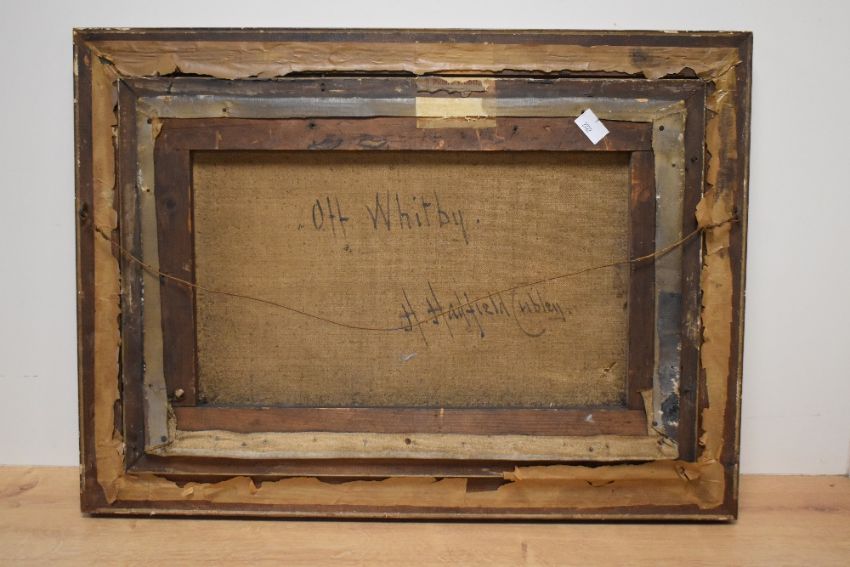 Henry Hadfield Cubley (British 1858-1934) oil on canvas, 'Off Whitby' coastal scene with boats, signed lower right, entitled verso, within a gilt slip and moulded gilt frame, under glass 29cm x 44cm & 42.5cm x 58cm overall.