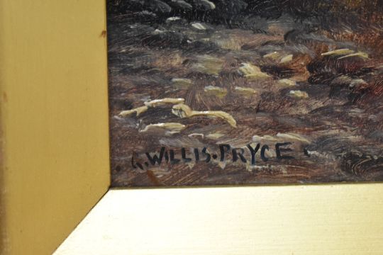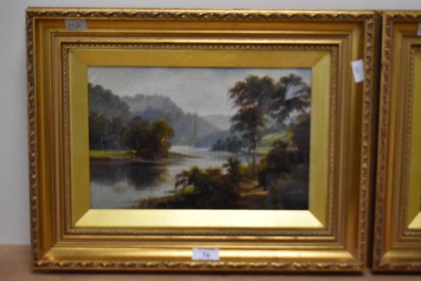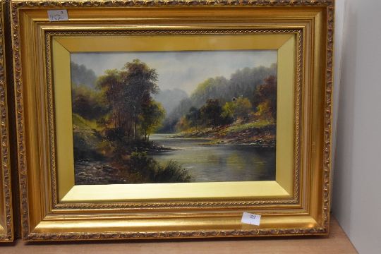 George Willis Pryce (British 1866-1949) a pair of river scene oil on canvas's., one signed lower left, both untitled, within gilt slips and moulded gilt frames, under glass 18.5cm x 29cm & 33cm x 43cm overall. One with small hole upper right quarter .