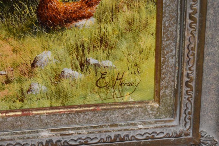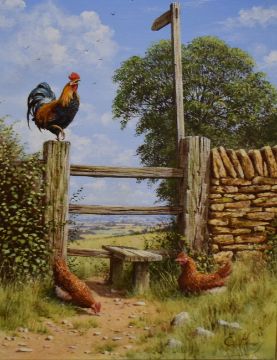 Edward Hersey (British b.1948) oil on canvas, cockerel and chickens at a country stile, signed lower right, within a moulded and painted frame 39.5cm x 29.5cm & 57cm x 48cm overall.