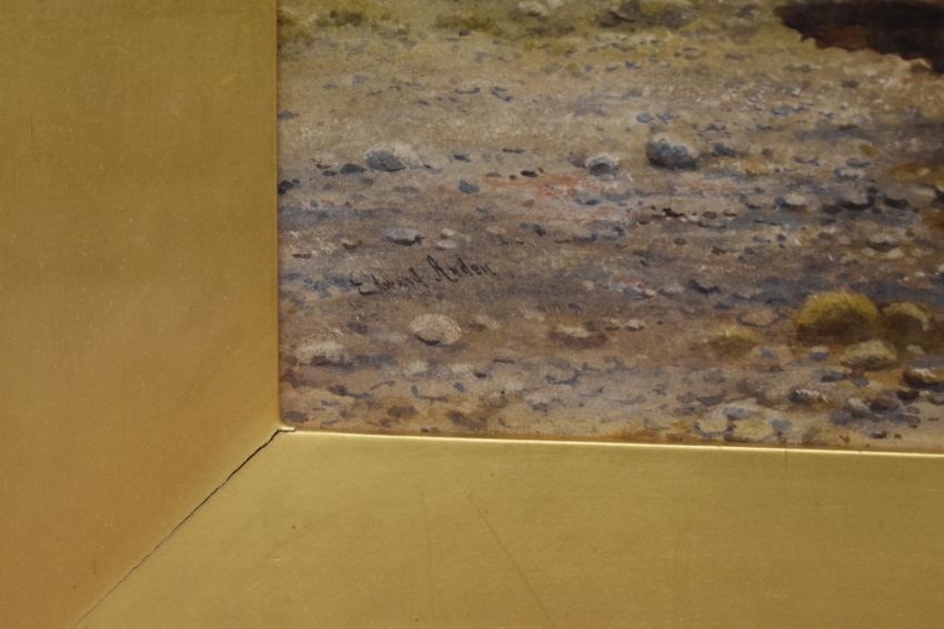 Local interest* Edward Arden (Tucker) (British 1830-1909) watercolour, lone fisherman within a local landscape with stream, signed lower left, within a gilt slip and moulded gilt frame, under glass 25cm x 38cm & 45cm x 59cm overall, some losses to frame.