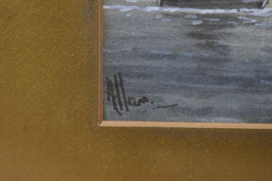 Richard Allam (British 19th century) watercolour, marina scene at dusk, signed lower left, within a gilt card mount and moulded gilt frame, under glass 13cm x 28cm & 29cm x 44cm overall.