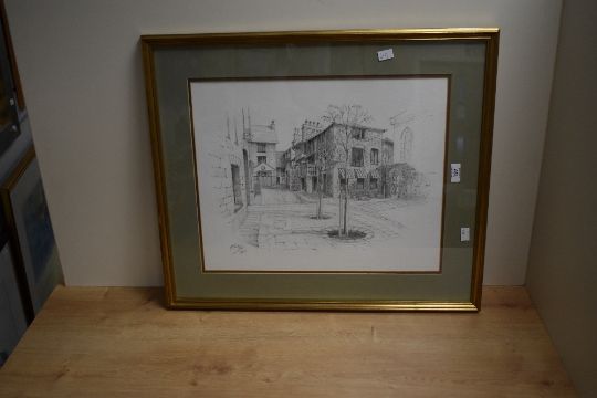 Local interest* B Travis (20th century) pencil drawing, Yard 23, Stricklandgate, Kendal, signed and dated 1983 lower left, within a stepped card mount and moulded gilt frame, under glass 38cm x 46cm and 55cm x 63cm overall.