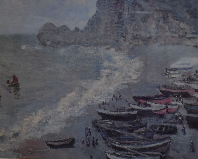 Claude Monet (French, 1840-1926) colour print depicting boats, cliffs and beach, within off white mount and moulded gilt frame, under glass. 38.5cm x 49cm, 59cm x 69cm overall.