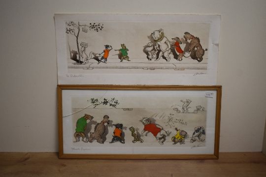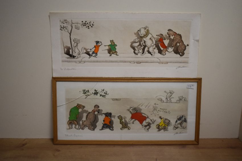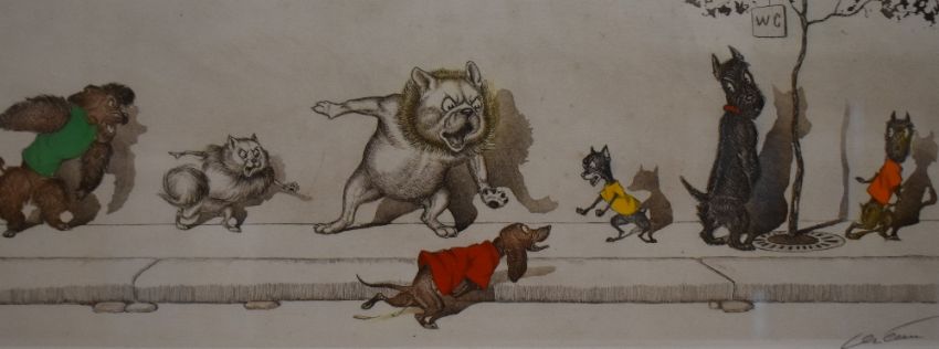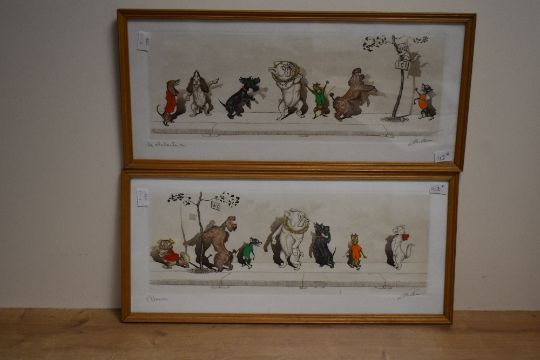 After Boris O'Klein (French 1893-1985) Dirty Dogs of Paris, a group of six coloured prints, each signed and entitled in pencil to margin, five framed behind glass, one unframed 24cm x 52cm overall. One glass with crack.