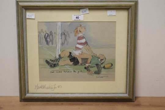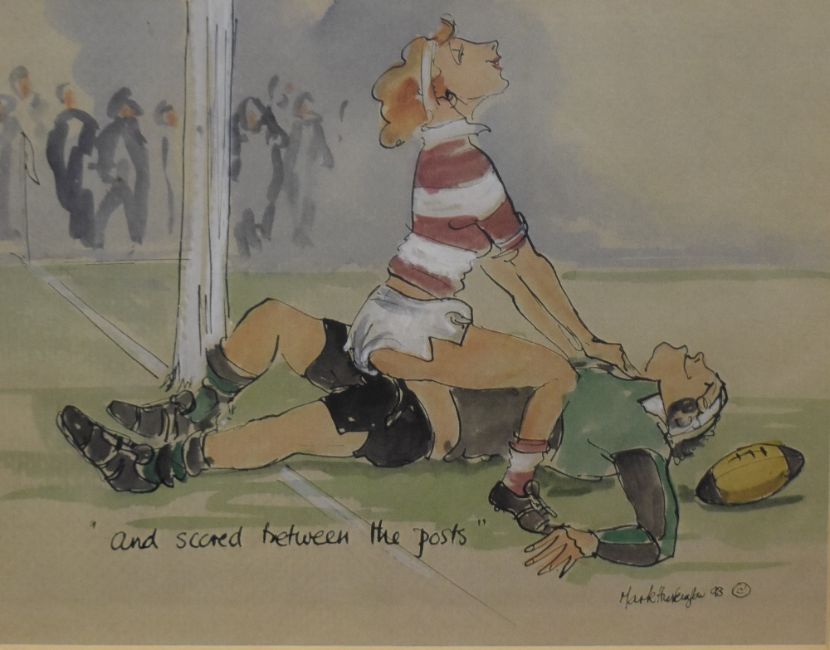 After Mark Huskinson (British 1935-2018) humorous colour print 'And Scored Between the Posts' signed and dated 97 in pencil to card mount, within a moulded frame, under glass 19.5cm x 25cm & 33cm x 38cm overall.