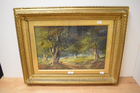John Enoch Brookes (flourished 1864-1873) oil on canvas, woodland scene with figure and dwelling, signed lower left, within a gilt slip and moulded gilt frame, under glass 29.5cm x 44cm & 52cm x 67.5cm overall, craquelure throughout, canvas appears to have lost tension, back of canvas inaccessible.