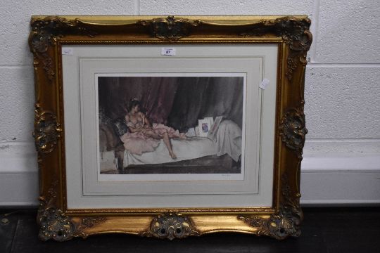 After Sir William Russell Flint R.A (British 1880-1969) two limited edition colour prints 'Cecilia and Her Studies' numbered 445/850 in pencil to margin along with blindstamp, within a lined card mount and ornate moulded frame, under glass 29cm x 39cm & 59cm x 69cm overall. And 'Artemis and Chione' numbered 250/850 in pencil to margin along with blindstamp, moulded, gilt framed behind glass 42.5cm x 56cm & 71.5cm x 85cm