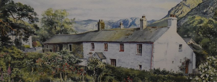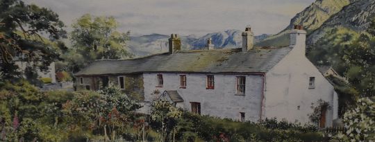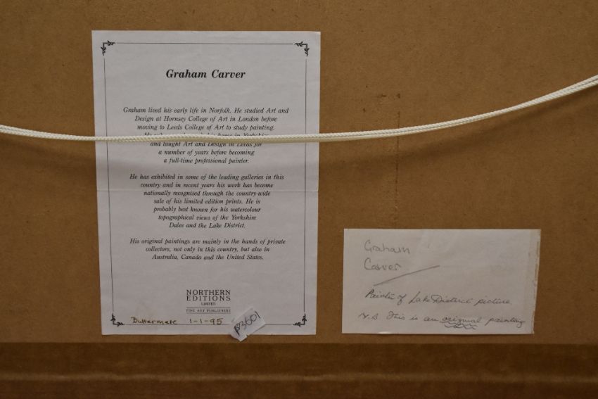 Local interest* After Graham Carver (British contemporary) decorative watercolour ' Evening Light'-Buttermere Cumbria, counter-signed and entitled in pencil to margin, within a card mount and moulded gilt frame, under glass 28cm x 62cm & 45cm x 80cm overall.