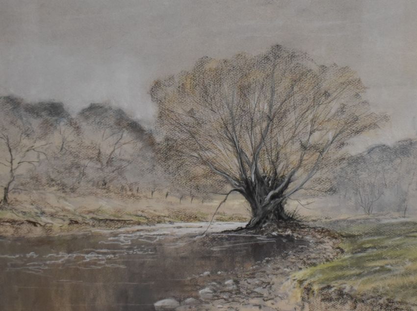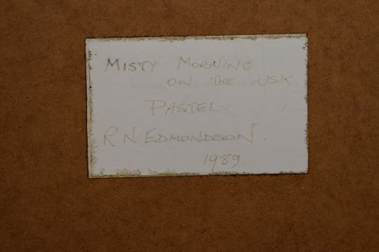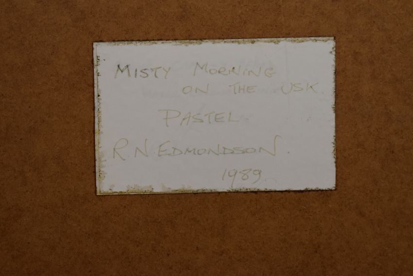 R.N Edmondson (British 20th century) mixed media, autumnal river scene, signed lower left, entitled to hand-written label verso, within a card mount and moulded frame, under glass 38cm x 48cm & 56cm x 66cm overall.